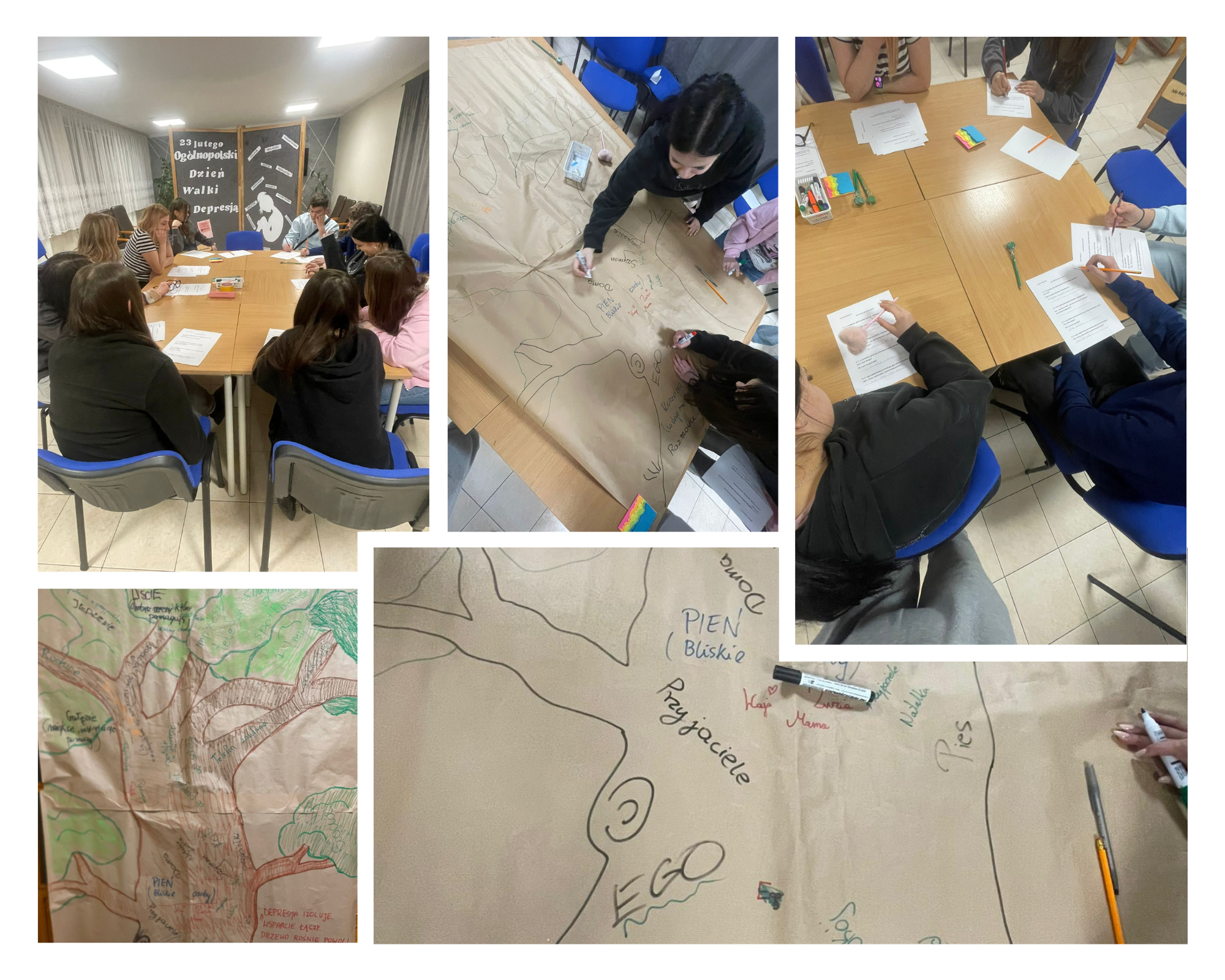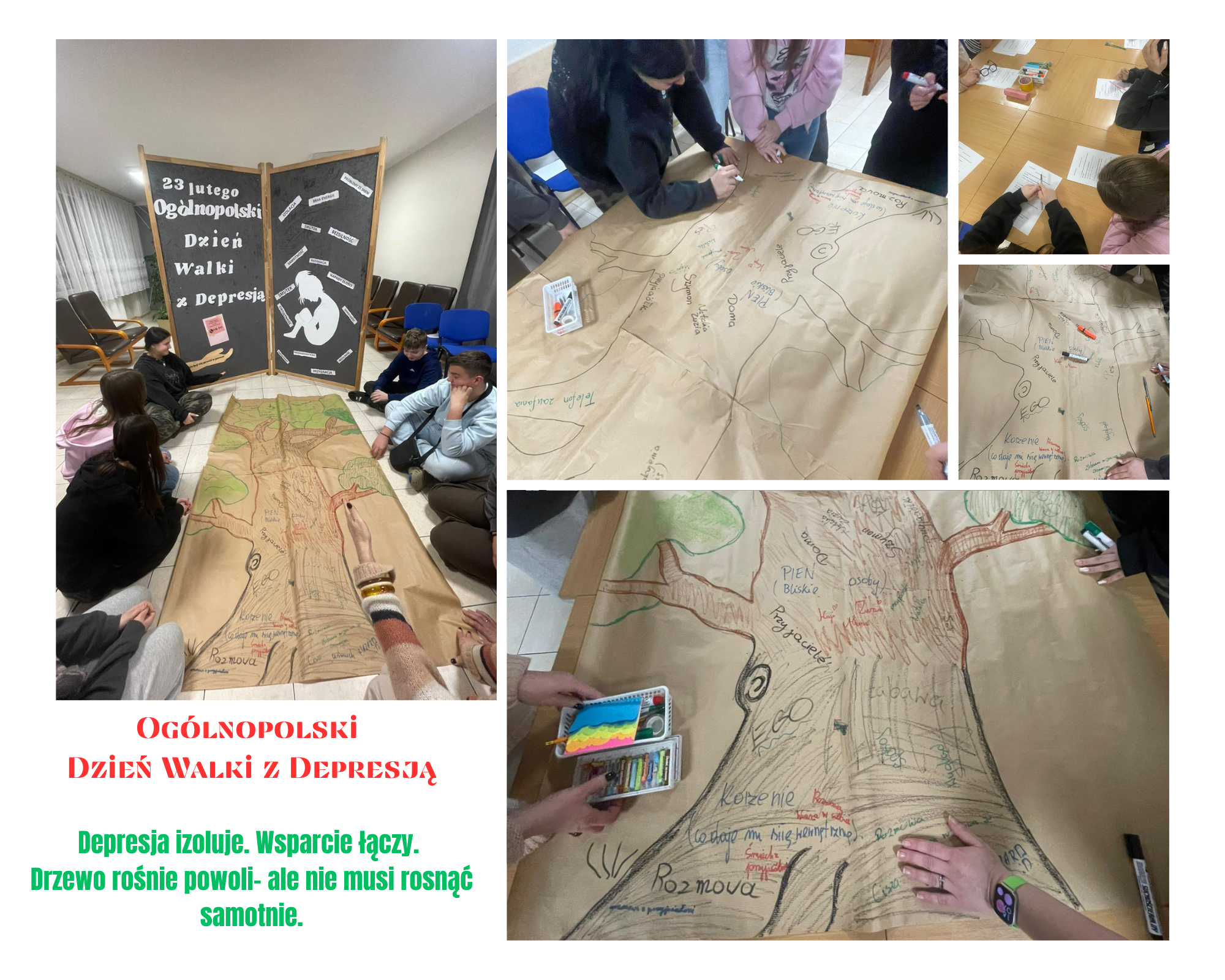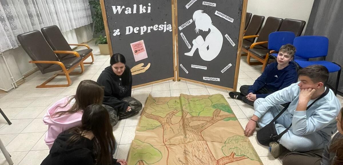 W dniu 24 lutego w naszym internacie odbyły się zajęcia profilaktyczne poświęcone tematyce depresji i zdrowia psychicznego młodzieży. Celem spotkania było zwiększenie świadomości wychowanków na temat tego, czym jest depresja, jakie są jej objawy oraz gdzie można szukać pomocy w sytuacji kryzysu emocjonalnego. Omówiono różnice między chwilowym obniżeniem nastroju, a stanem wymagającym wsparcia specjalisty oraz zwrócono uwagę na sygnały ostrzegawcze. Wychowankowie aktywnie uczestniczyli w zajęciach, pracując z kartami pracy dotyczącymi rozpoznawania objawów depresji, faktów i mitów oraz wskazywania osób i instytucji udzielających pomocy. W czasie zajęć powstało „Drzewo wsparcia”. Każdy wniósł coś od siebie, a efekt pokazał, jak ważna jest jedność, życzliwość i wzajemne wsparcie. To była cenna lekcja integracji i budowania relacji w grupie.